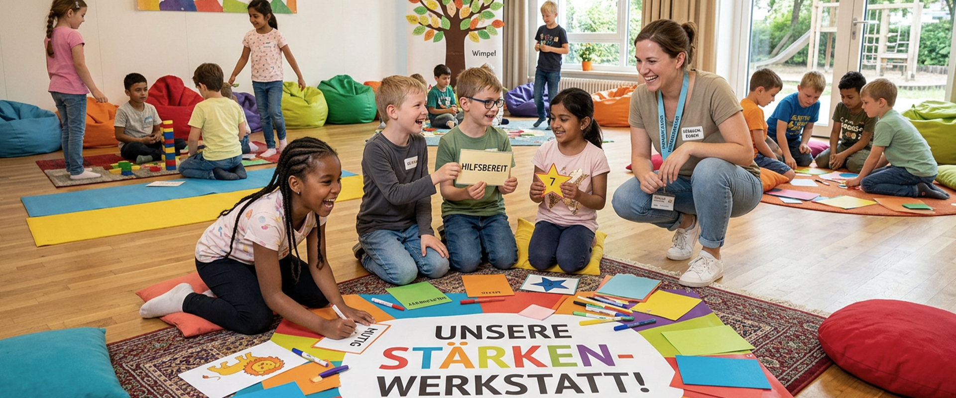 Als Elternteil bist Du eine Schlüsselperson in der Entwicklung deines Kindes. Unsere Workshops binden dich mit ein – in kurzen Elternimpulsen zeigen wir, was dein Kind gelernt hat, warum das wichtig ist und wie Du die Stärkenarbeit zu Hause ganz einfach weiterführen kannst.